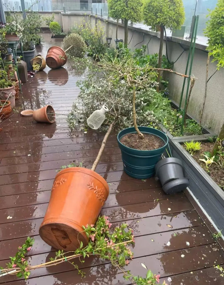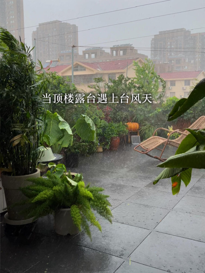 我家是入住后第一次遇到台风,第二天露台不堪入目:一大盆绿植全倒了,小盆栽七零八落,泥土、叶子、雨水混成一片。