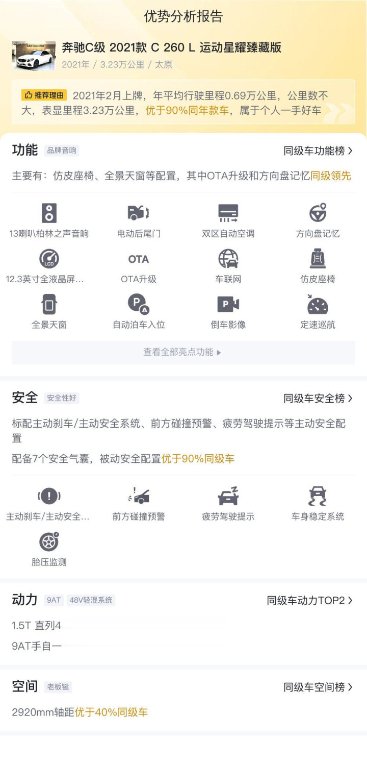 这款奔驰C级 2021款 C 260 L 运动星耀臻藏版上牌地为山西太原,上牌日期2021年2月,表显里程3.23万公里,新车指导价35.68万,二手车报价17.98万,过户次数0次。支持分期购车,首付最低5.39万。