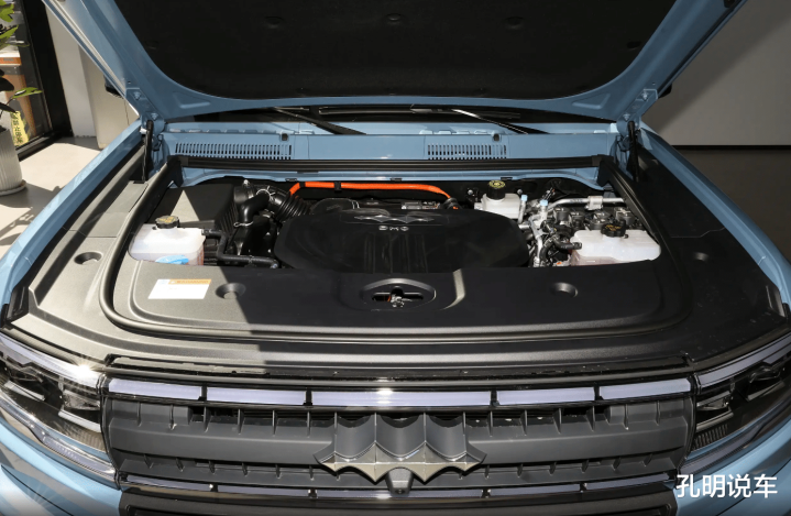 虽然发动机舱里面只是一台1.5升排量涡轮增压发动机,自身输出也不过194马力并不算特别强。但现在比亚迪这套插电混动系统重点并不是内燃机,即便是这款车的低配已经有660马力综合输出的双电机了,所以要论性能的话,方程豹豹5入门版本已经可以做到零百加速成绩4.8秒,再加上带大梁的非承载式车身结构,这款车是可以玩一些高难度越野的。